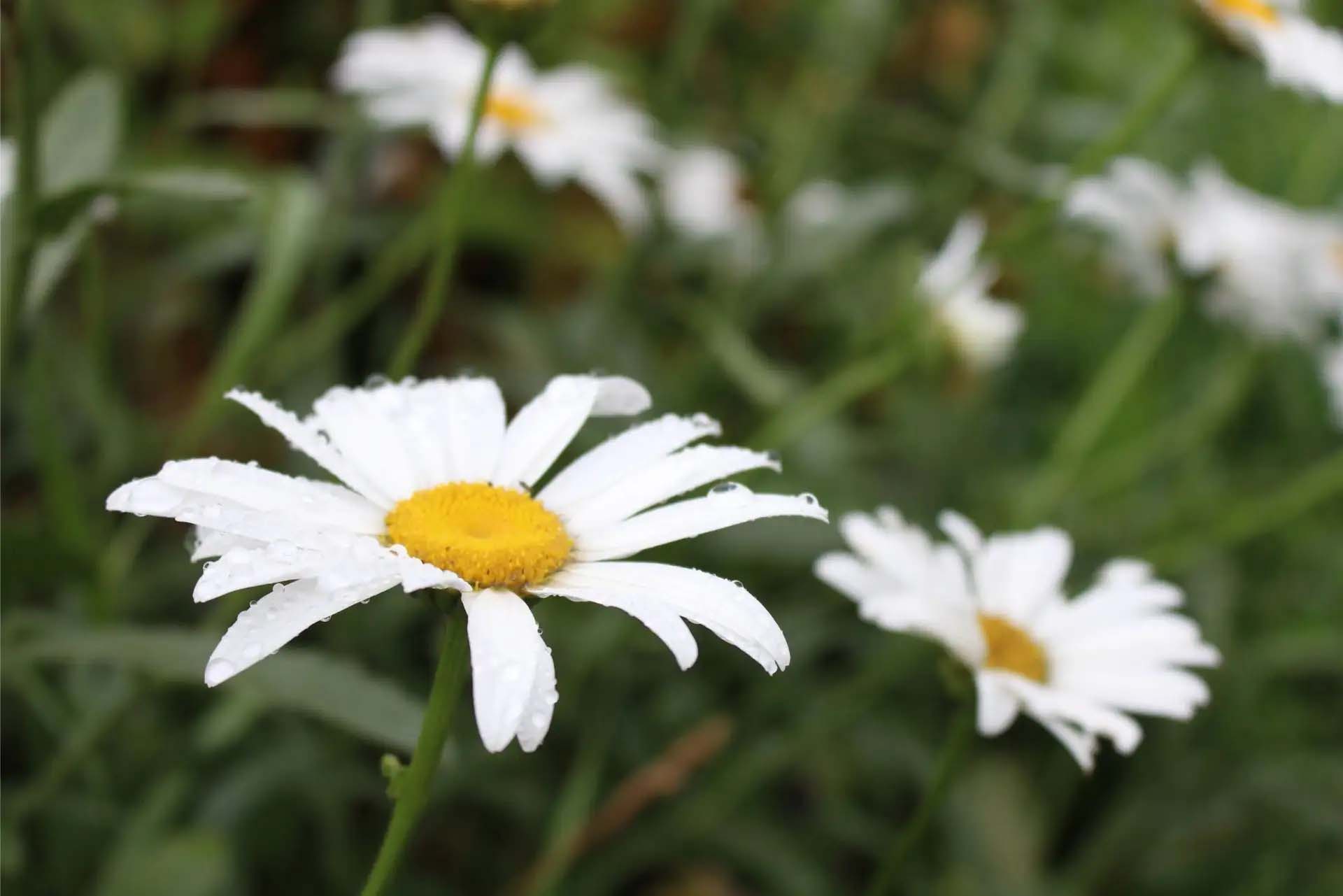 Eine Nahaufnahme von Gänseblümchen mit Tautropfen auf den Blütenblättern.